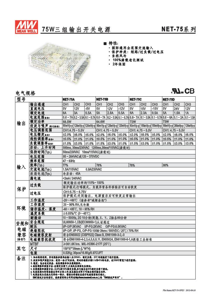 明纬三组输出开关电源NET-75系列NET-75A ,NET-75B,NET-75C ,NET-75D