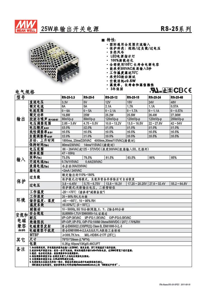 明纬单组输出开关电源RS-25系列RS-25-3.3,RS-25-5,RS-25-12,RS-25-15,RS-25-24,RS-25-48