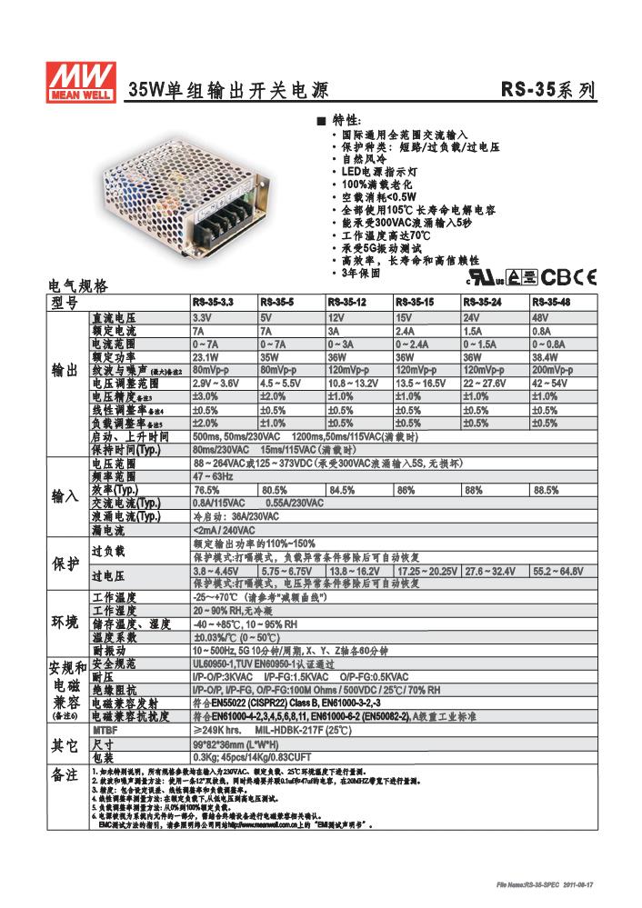 明纬单组输出开关电源RS-35系列RS-35-3.3,RS-35-5,RS-35-12,RS-35-15,RS-35-24,RS-35-48