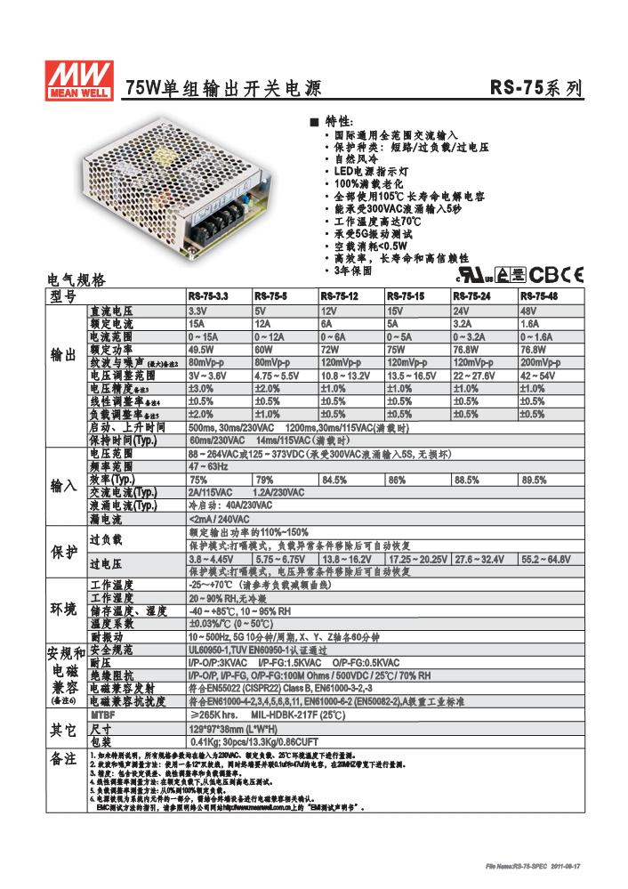 明纬单组输出开关电源RS-75系列RS-75-3.3,RS-75-5,RS-75-12,RS-75-15,RS-75-24,RS-75-48
