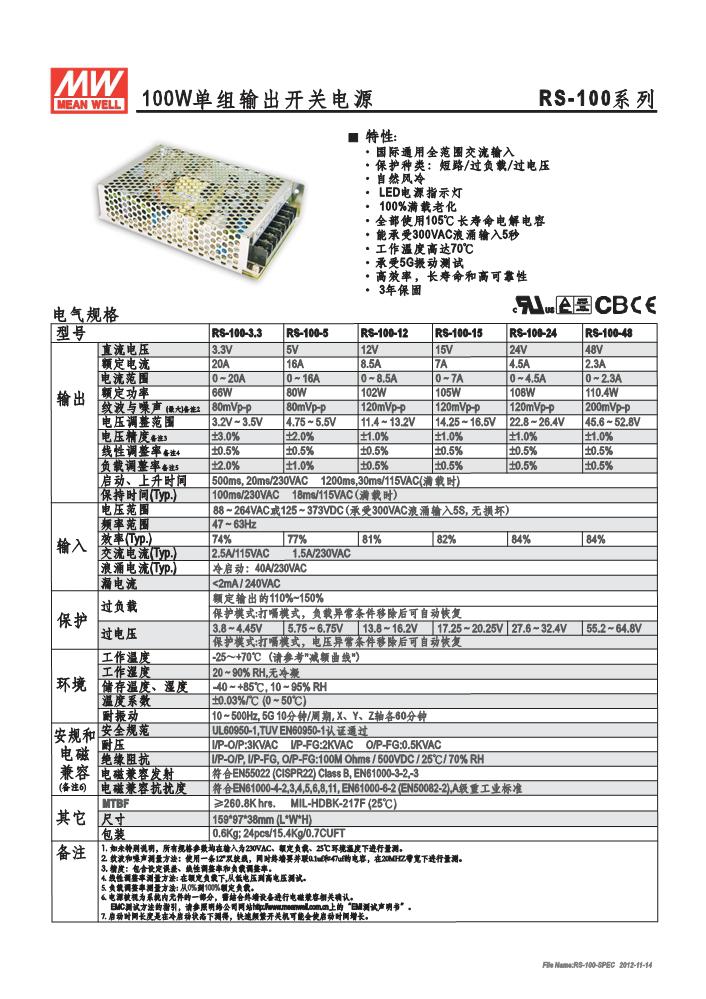 明纬单组输出开关电源RS-100系列RS-100-3.3,RS-100-5,RS-100-12,RS-100-15,RS-100-24,RS-100-48
