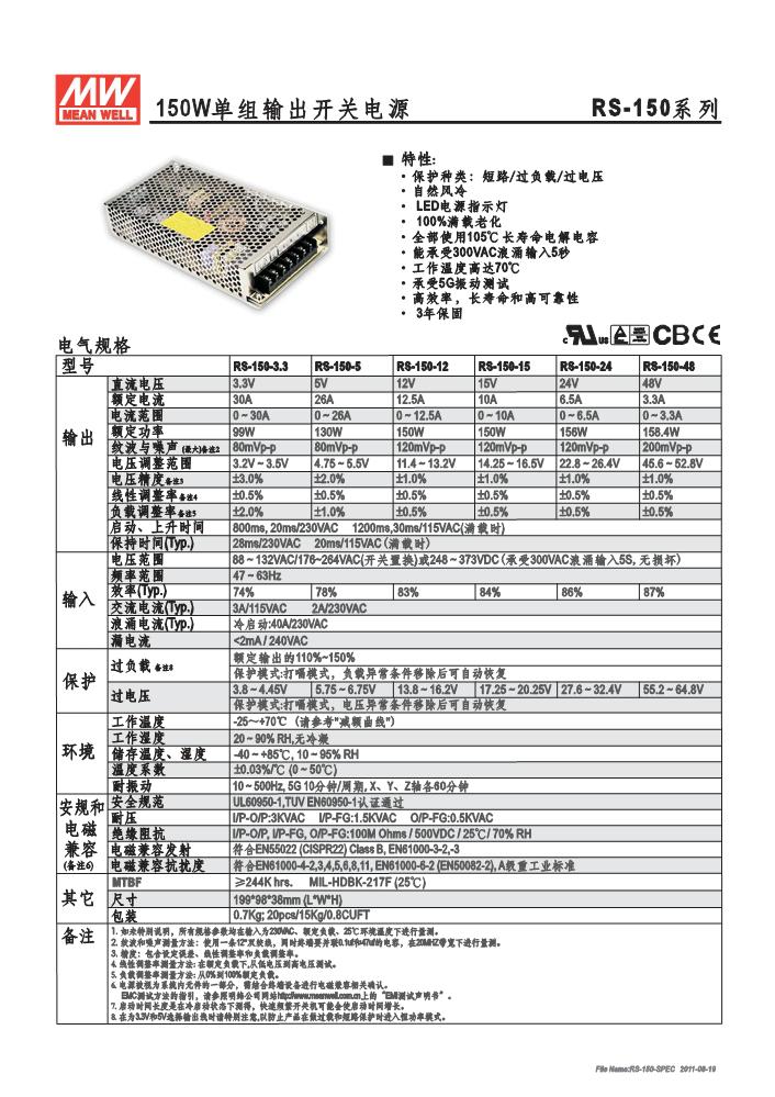 明纬单组输出开关电源RS-150系列RS-150-3.3,RS-150-5,RS-150-12,RS-150-15,RS-150-24,RS-150-48