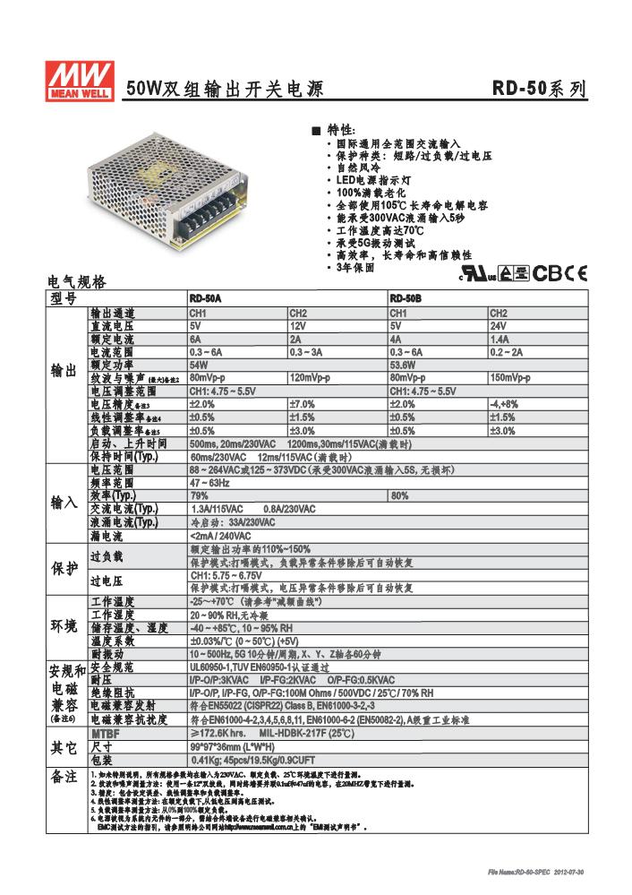 明纬单组输出开关电源RS-50系列RS-50-3.3,RS-50-5,RS-50-12,RS-50-15,RS-5024,RS-50-48