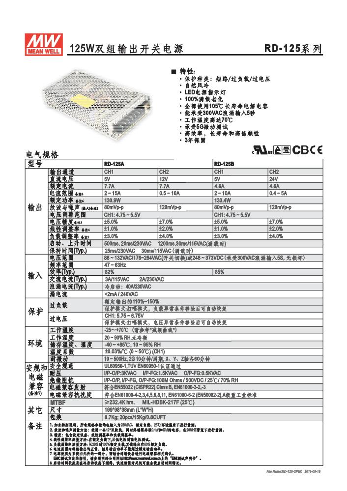 明纬双组输出开关电源RD-125系列 RD-125A,RD-125B