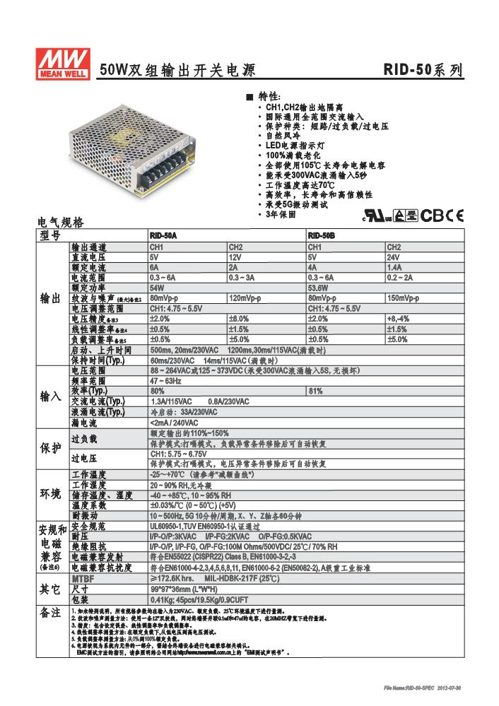 明纬双组输出开关电源RID-50系列 RID-50A,RID-50B