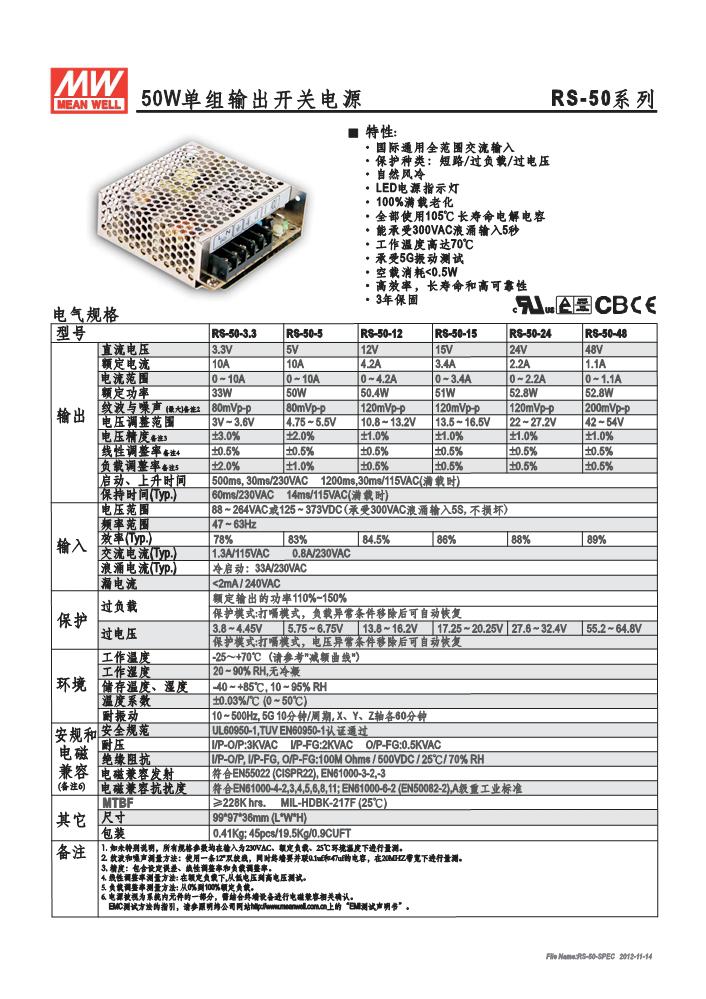 【产品名称】明纬开关电源RS-50系列—深圳明纬开关电源一级代理商