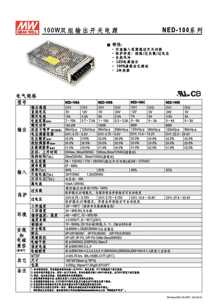 明纬双组开关电源NED-100系列NED-100A ,NED-100B,NED-100C ,NED-100D