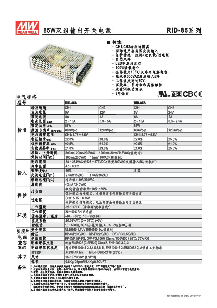 【产品型号】明纬双组输出开关电源RID-85系列